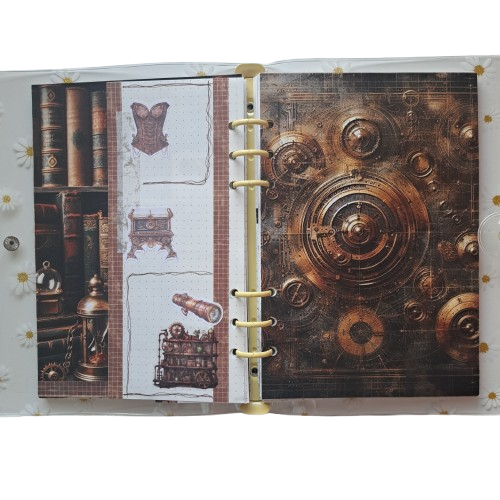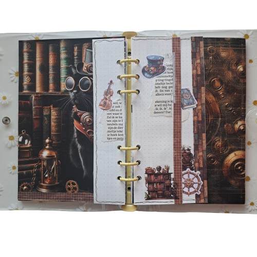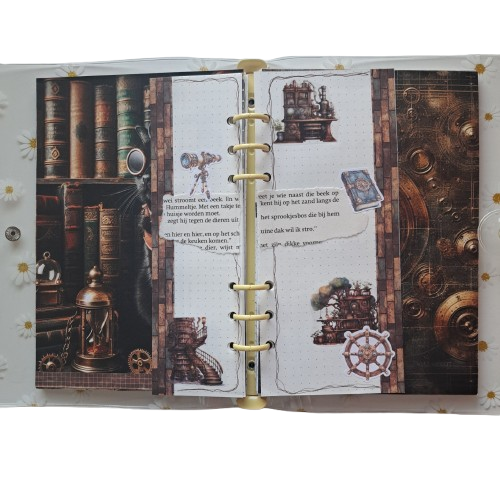 Deze Steampunk journal set neemt je mee naar een wereld vol koper, tandwielen en mysterieuze uitvindingen. De combinatie van vintage boeken en mechanische elementen geeft je pagina’s meteen dat typische Steampunk-gevoel: avontuurlijk, industrieel en toch elegant. Het is een thema waarin je eindeloos kunt spelen met lagen, texturen en kleine details — perfect voor journaling!