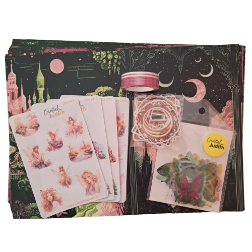 15 vellen A4 papier, 30 label stickers, 4 stickervellen, 1 washi tape, 16 die cuts